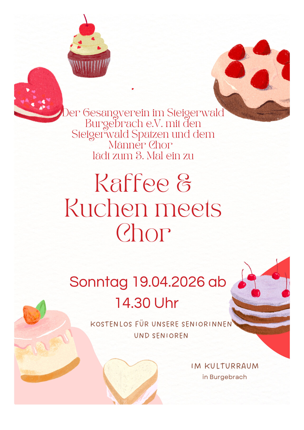 Am 19. April 2026 findet ab 14.30 Uhr unser Seniorennachmittag mit Kaffee und Kuchen im Kulturraum, Grasmannsdorfer Straße in Burgebrach, statt.